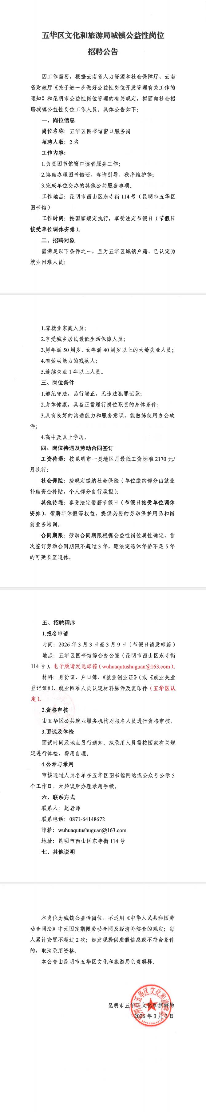 五华区文化和旅游局城镇公益性岗位 招聘公告